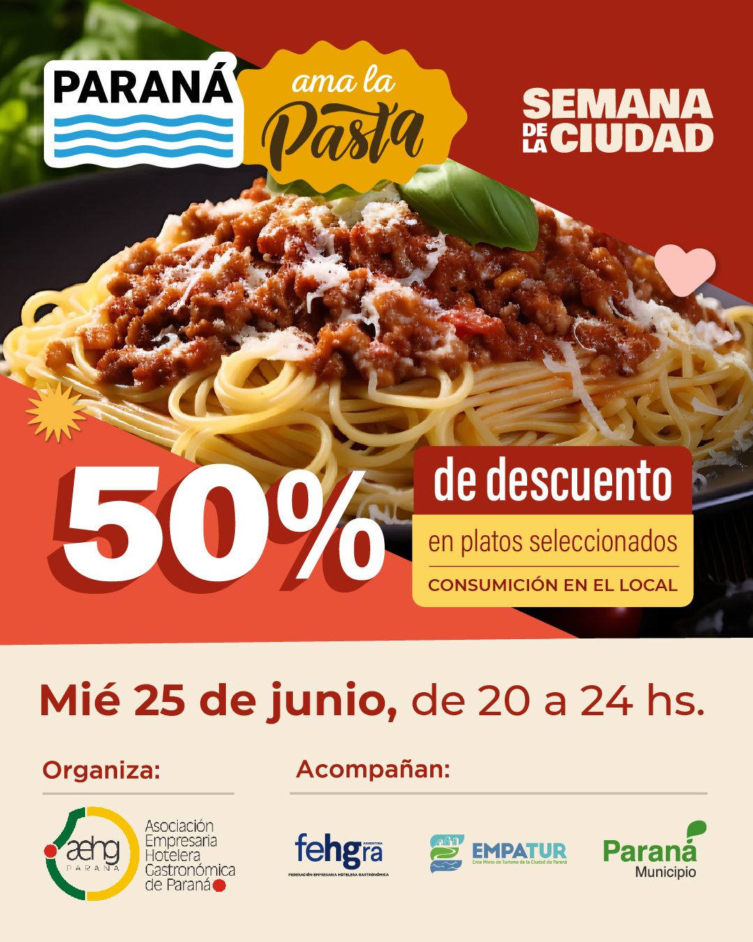 Agendate, este miércoles 25 de junio festejamos el aniversario de Paraná comiendo pasta con 50% de descuento de 20 a 24 hs.