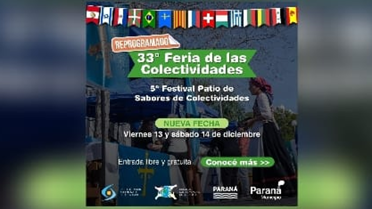Se realizará una nueva edición de esta ya tradicional Feria de Colectividades. La misma tendrá lugar los próximos 13 y 14 del mes de diciembre y participará también el 5º Festival de Patio de Sabores de Colectividades. Participarán en esta oportunidad más de 30 colectividades en gastronomía, cultura y espectátculos.