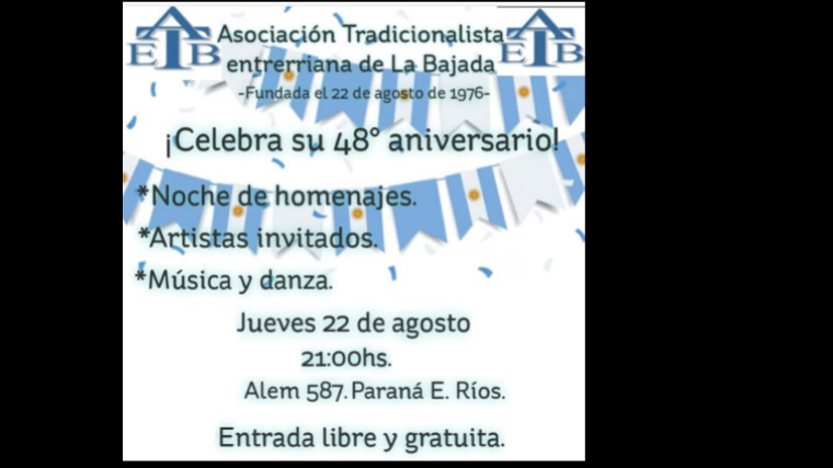 La Asociación Tradiocionalista Entrerriana de la Bajada fundada el 22 de agosto de 1976, celebra su 48º aniversario en una noche de homenajes, de música, danza, con artistas invitados y mucho más.