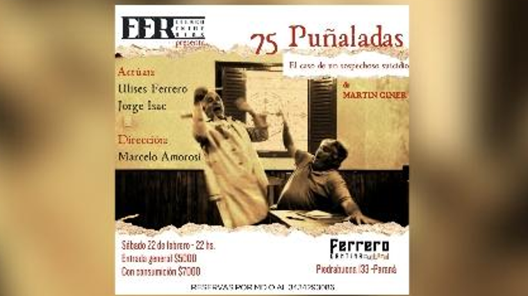 Se presentará una obra de teatro llamada "75 Puñaladas", el caso de un sospechoso suicidio." Una comedia con el misterio que nos tiene acostumbrados su autor Martin Giner. Con las actuaciones de Ulises Ferrero y Jorge Isac, bajo la dirección de Marcelo Amorosi.-