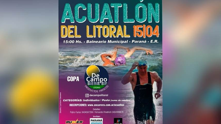 Inscripciones vía www.encarrera.com.ar/acuatlon / Para más información 3434597206 (Pablo Farías) o 3434400878 (Fernando Friedrich)