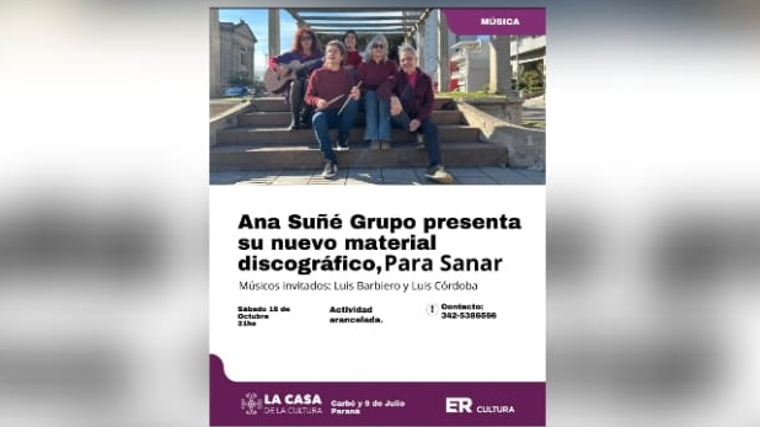 Ana Suñé Grupo presenta su nuevo Disco "Para Sanar", publicado recientemente por el sello Shagrada Medra. El grupo, oriundo de la ciudad de Santa Fe,fue creado en el año 2002 por la cantautora Ana Suñé. Actualmente está integrado por Pancho Torres: dirección musical, guitarra. Elina Goldsack piano, flauta traversa y coros. Hernán Carnero: Batería. Pilar Ferrando: Bajo, coros. Ana Suñé: Voz y guitarra. La propuesta contará con la participación de Luis Barbiero y Luis Córdoba en carácter de artistas invitados.