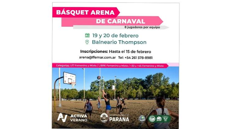 El 19 y 20 de febrero se realizará el "Basquet Arena de Carnaval" de categorías: U17 Femenino y Mixto; Libre Femenino y Mixto; +35 y +45 Femenino y Mixto.
