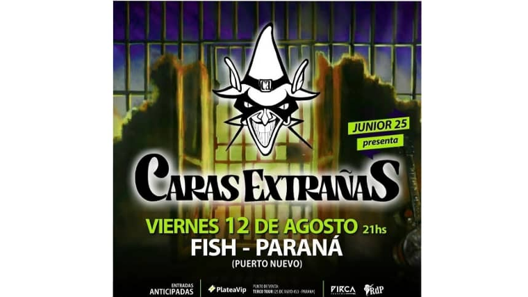 Compuesta por “Junior” en Voz y Guitarra, Rodia en Guitarra acústica, Heber en Batería, Gastón Picazo en Teclados, “Arito” en Guitarra, “Garfield” en Bajo, Juan “el Niño” en Armónica y Enzo en Saxo, "Caras extrañas" es una banda que se formo a mediados del año pasado, llega a nuestra ciudad el viernes 12 de agosto. ¿Te lo vas a perder?
