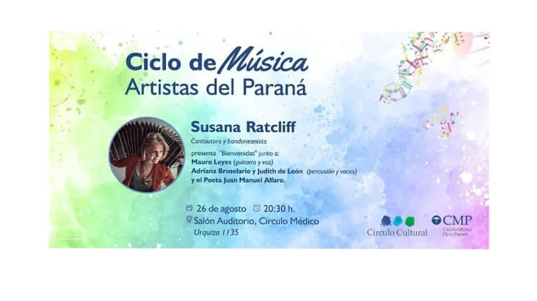 El Círculo Médico invita a la segunda fecha del Ciclo de Música Artistas del Paraná. Se presentará la bandoneonista y compositora Susana Ratcliff en el Auditorio del Círculo Médico. La acompañarán Mauro Leyes (guitarra y voz), Adriana Bruselario & Judith de León (percusión y voces) y la participación especial del Poeta Juan Manuel Alfaro.