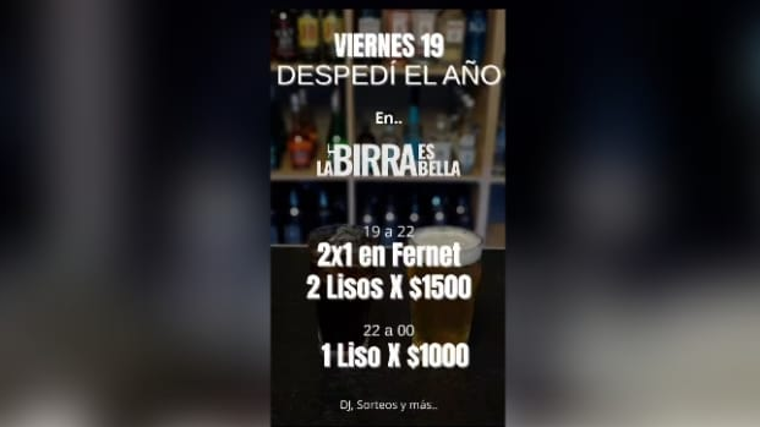 El ya tradicional Bar "La Birra es Bella" despide el año con música en vivo, Dj, sorteos, happy Hour y mucho más.