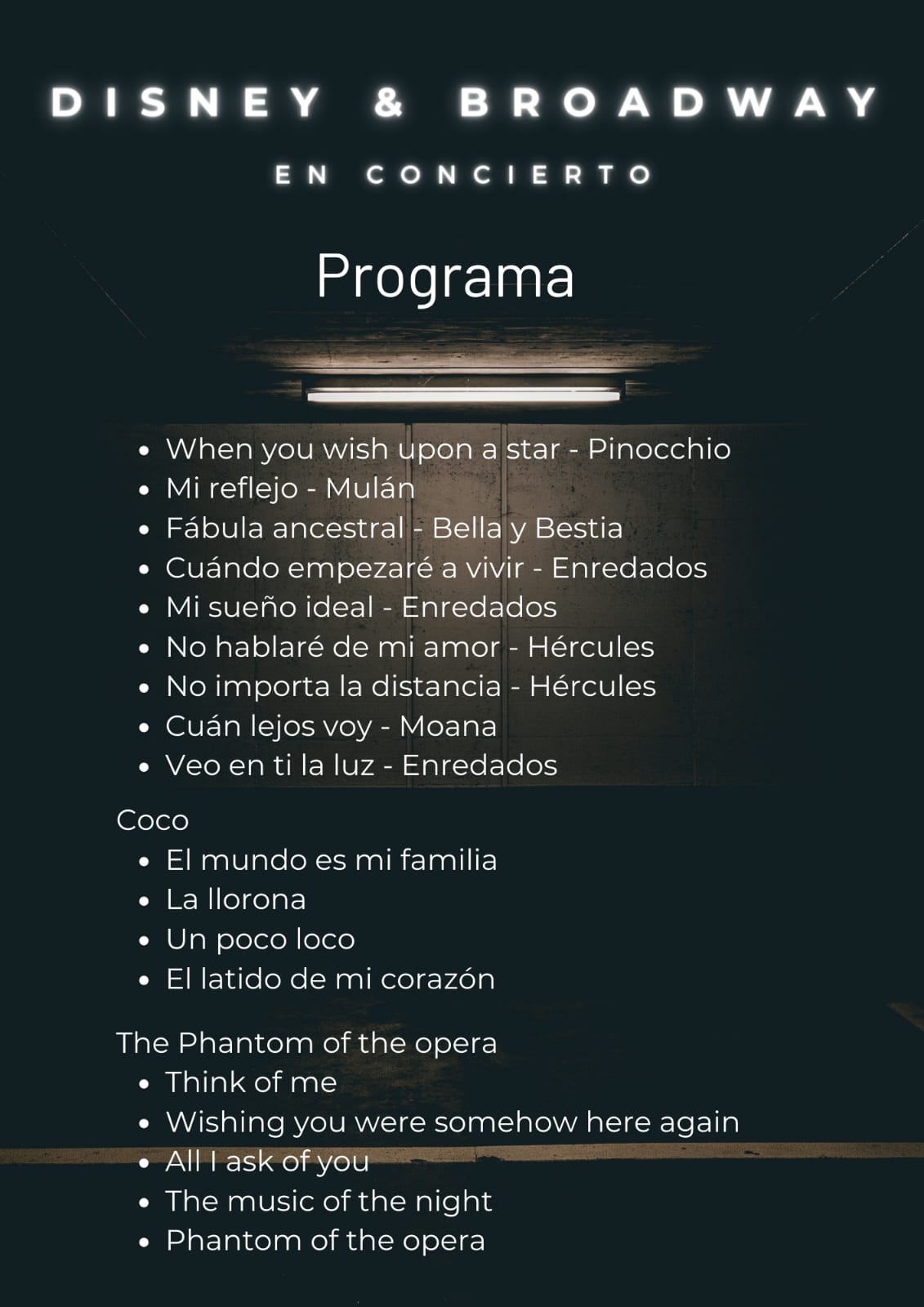 "Disney & Broadway" es un Concierto de solistas y piano donde abordaremos un amplio repertorio de películas y musicales de Disney y para finalizar unos de los musicales líricos más famosos de todos los tiempos El fantasma de la Ópera.