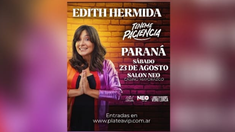 Vuelve la genia de Edith Hermida a Paraná para presentar su show “Teneme Paciencia”. En este espectáculo, Edith Hermida, debuta con su unipersonal. La reconocida conductora, locutora, actriz y panelista de Bendita nos invita a desdramatizar y reírnos de todo. Cómo nos atraviesa el cambio radical del modelo de nuestros padres al modelo de los adolescentes de hoy, ser hija y madre en esta época, la tecnología, la música, el ritmo cotidiano, los clichés, los mandatos, el sexo, volver al ruedo después de los 50 y mucho más, serán temas que se abordan en el show, donde el público se identificará, se reirá y hasta hará catarsis. Edith se define como una “disfrutona serial” y nos invita a disfrutar con ella. “Teneme paciencia” es un show con mucho humor, y cuenta con el libro y la dirección de la comediante y dramaturga Vero Lorca. Canciones, chistes y anécdotas personales completan esta propuesta diferente donde Edith ¡Se anima a contar todo! Un show para disfrutar sin ansiedades.