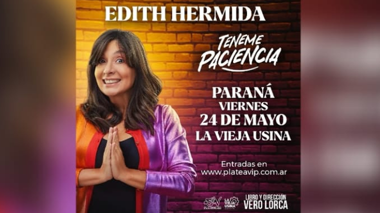 Edith Hermida debuta con un unipersonal bajo el nombre de "Teneme paciencia", un show con mucho humor, y cuenta con el libro y la dirección de la comediante y dramaturga Vero Lorca. La reconocida conductora, locutora, actriz y panelista de Bendita nos invita a desdramatizar y reírnos de todo. Cómo nos atraviesa el cambio radical del modelo de nuestros padres al modelo de los adolescentes de hoy, ser hija y madre en esta época, la tecnología, la música, el ritmo cotidiano, los clichés, los mandatos, el sexo, volver al ruedo después de los 50 y mucho más.