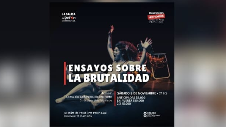 Ensayos sobre la brutalidad: “una parodia desplegada a través del teatro físico y la danza. Un retrato del destrato. Un reflejo de aquella mitad, lengua filosa, cruel y tirana que estalla y aturde. Un imposible desconcertante, que ocultamos bajo la alfombra y hoy deambula ya no frágil, en las calles a nuestro lado”. Claudia e Inés viven encerradas cómodamente en sus casas de un barrio privado, pero una horda de animales salvajes amenaza con romper su comodidad. Mientras observan el afuera con miedo e incomprensión, ensayan teorías sobre lo que debe ser y lo que no en ese afuera que no se atreven a pisar. Cual rey Midas, el vínculo con su propio entorno se volverá sórdido, delirante y corroído por el deseo desmedido hacia sus pertenencias.