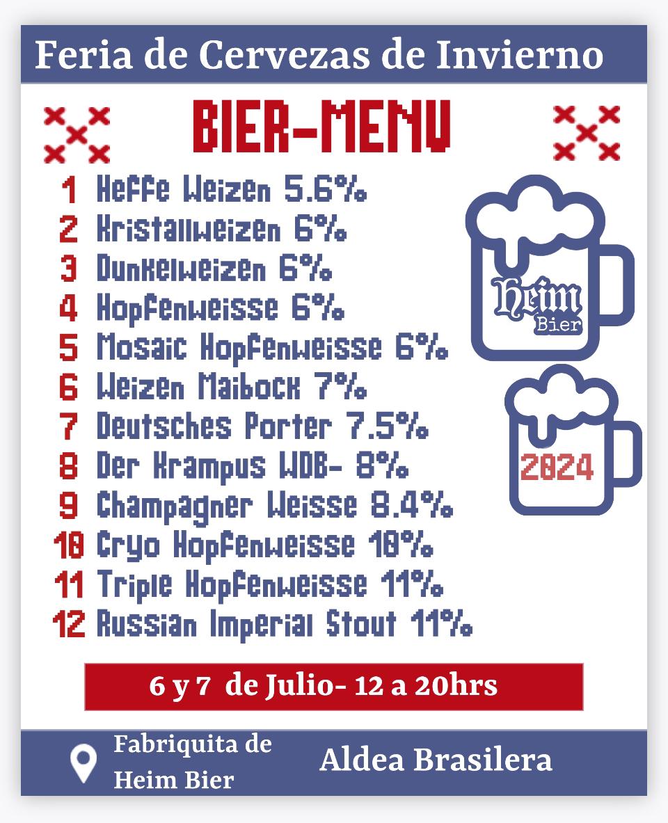 Tercera edición de Feria de Cervezas de Invierno, organizada en conjunto con el grupo de Emprendedores “Aldea Brasilera Emprende” y Cervecería Artesanal Heim Bier. Se realizará los días Sábado 6 y Domingo 7 de Julio y contará con Emprendedores Gastronómicos y Artesanos locales sumado a una selección de Cervezas de Edición especial para dicho evento. Se presentarám, además, distintas bandas como ser: The Pickwick Club (música tradicional de las islas británicas), Texu (Folk Celta), Lucho Quiñones Folk y Cumpa (Dúo Musical).