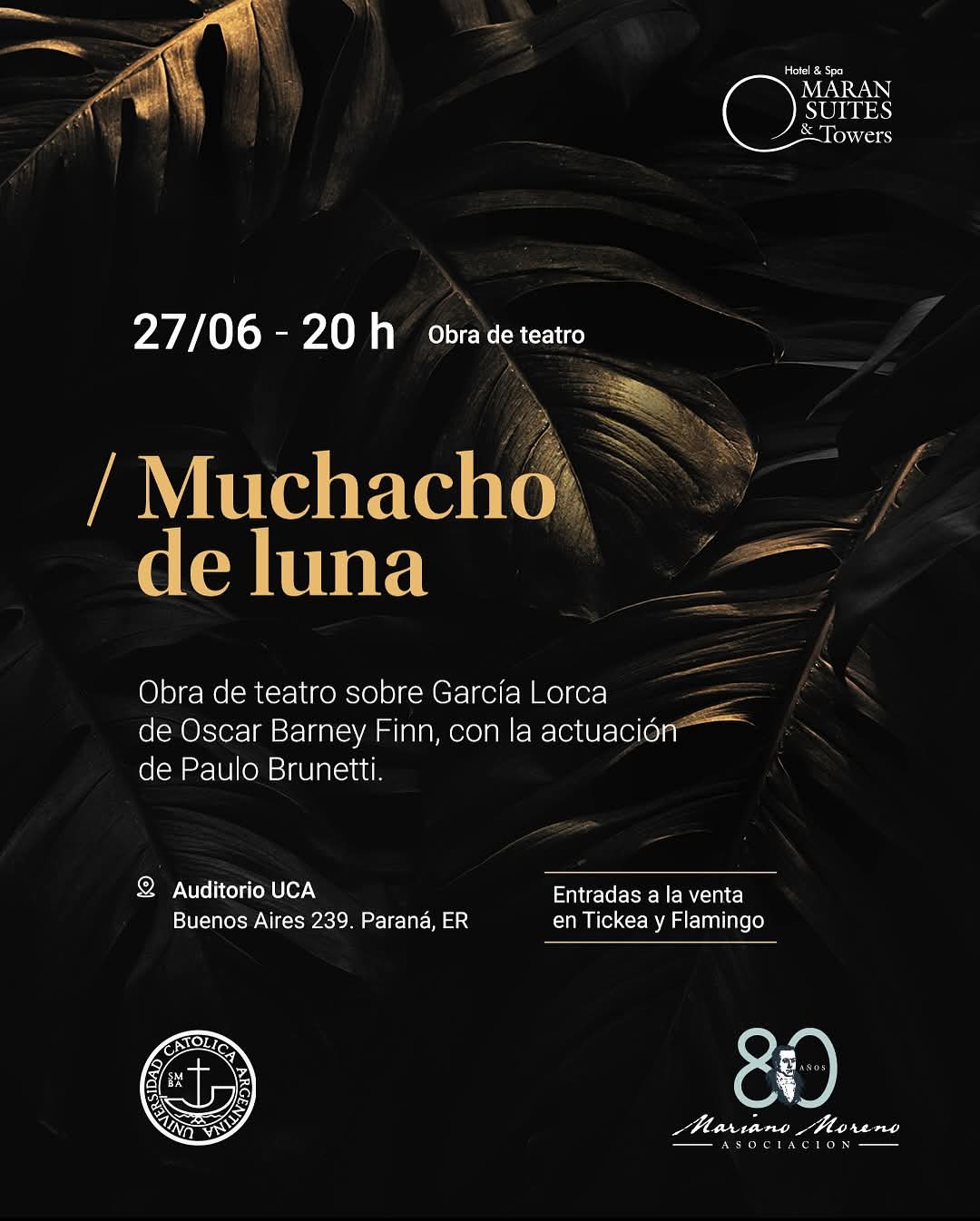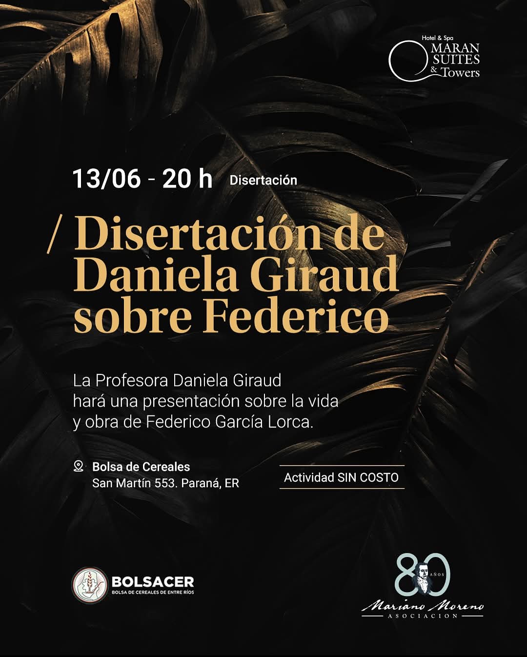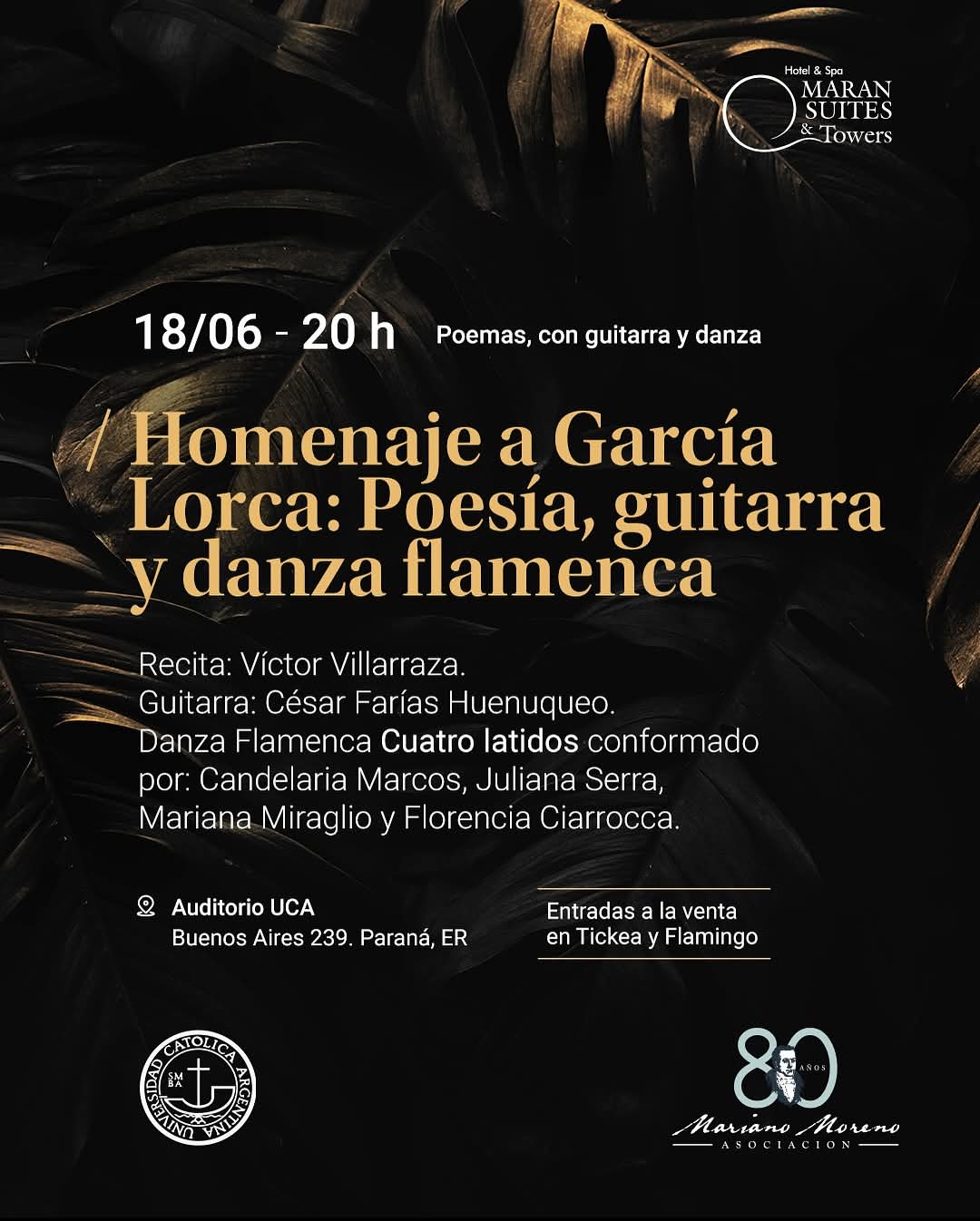 Festival en Homenaje al poeta andaluz Federico García Lorca. Víctor Villarraza nos deleitará con poemas, César Farías Huenunqueo interpretará, en guitarra, la música compuesta por Federico, tan poco conocida, y que responde a un trabajo de investigación del guitarrista. Para completar la noche, Candelaria Marcos, Juliana Serra, Mariana Miraglio y Florencia Ciarrocca interpretarán danzas de honda raigambre andaluza. El mismo se dividira en tres jornadas distintas: