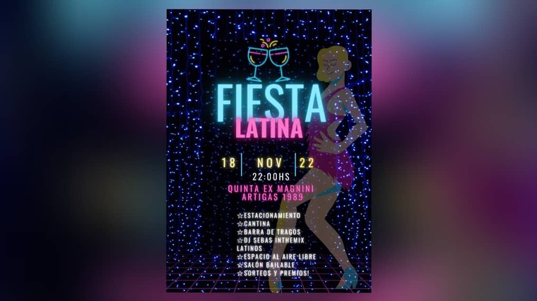Fiesta Latina para +30 años. Contará con cantina, barra, espacio descubierto y estacionamiento.