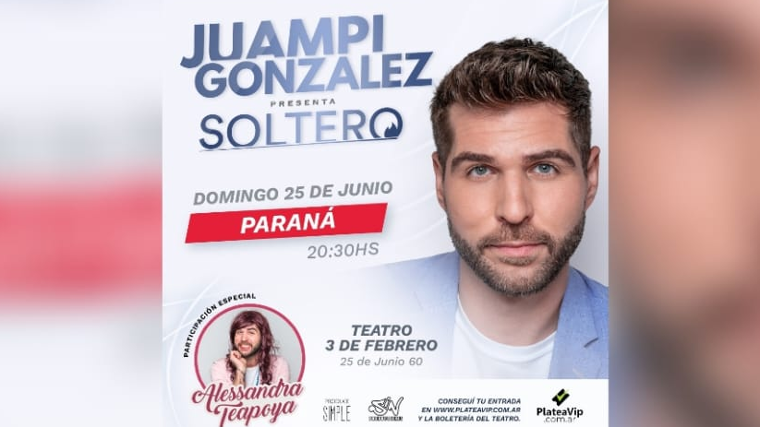 Juampi Gonzalez es un humorista que se dedica al Stand Up y se presentará en nuestra ciudad con su show llamado "Soltero" en el cual hace un repaso de lo bueno y lo malo de ser soltero, contando su relación con las mujeres, el sexo y el paso de dejar de vivir con sus padres, o al menos intentarlo.