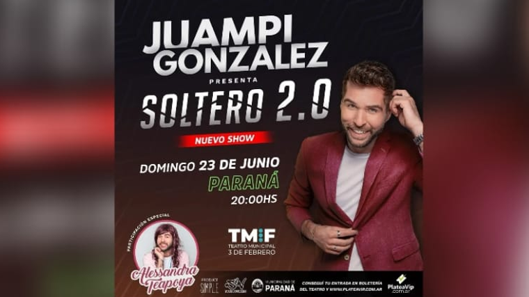 Vuelve Juampi Gonzalez a nuestra ciudad presentando su nuevo Show "Soltero 2.0" En este nuevo show Juampi seguirá desplegando toda su espontaneidad, creatividad, carisma, rapidez, humor picante...y por supuesto, su singular manera de ver la realidad del SOLTERO.