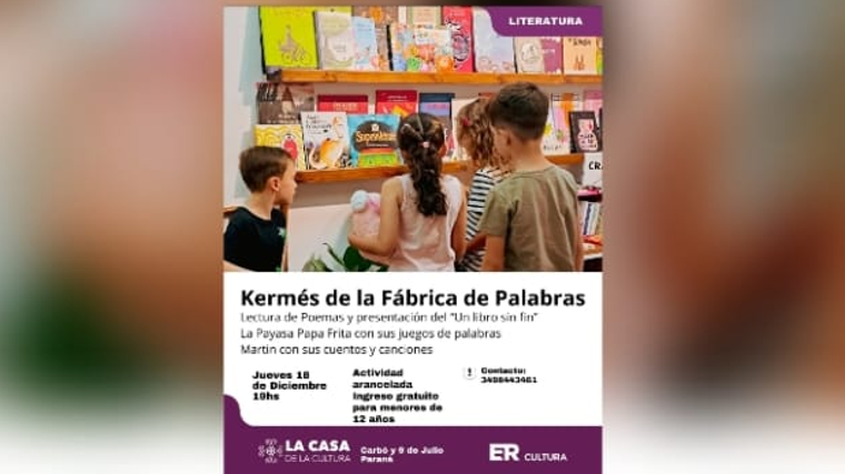 Kermés de la Fábrica de Palabras: Una propuesta que contará además con la participación de La Payasa Papa Frita con sus juegos de palabras y Martin con sus cuentos y canciones. Habrá lectura de poemas, y la presentación de "Un libro sin fin".