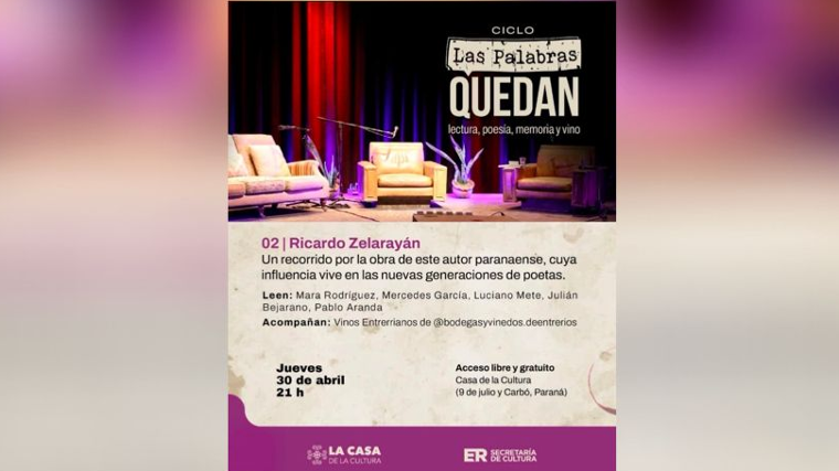Nueva propuesta de “Las Palabras Quedan”, un encuentro con lectores, memoria, poesía y vino. Leerán Mara Rodríguez, Mercedes García, Luciano Mete, Julián Bejarano y Pablo Aranda. Las palabras quedan es un ciclo mensual de lecturas imprescindibles de autoras y autores de la literatura entrerriana amorosamente acompañados por los vinos de la provincia de Entre Ríos a cargo de @bodegasyvinedos.deentrerios (Instagram) .-