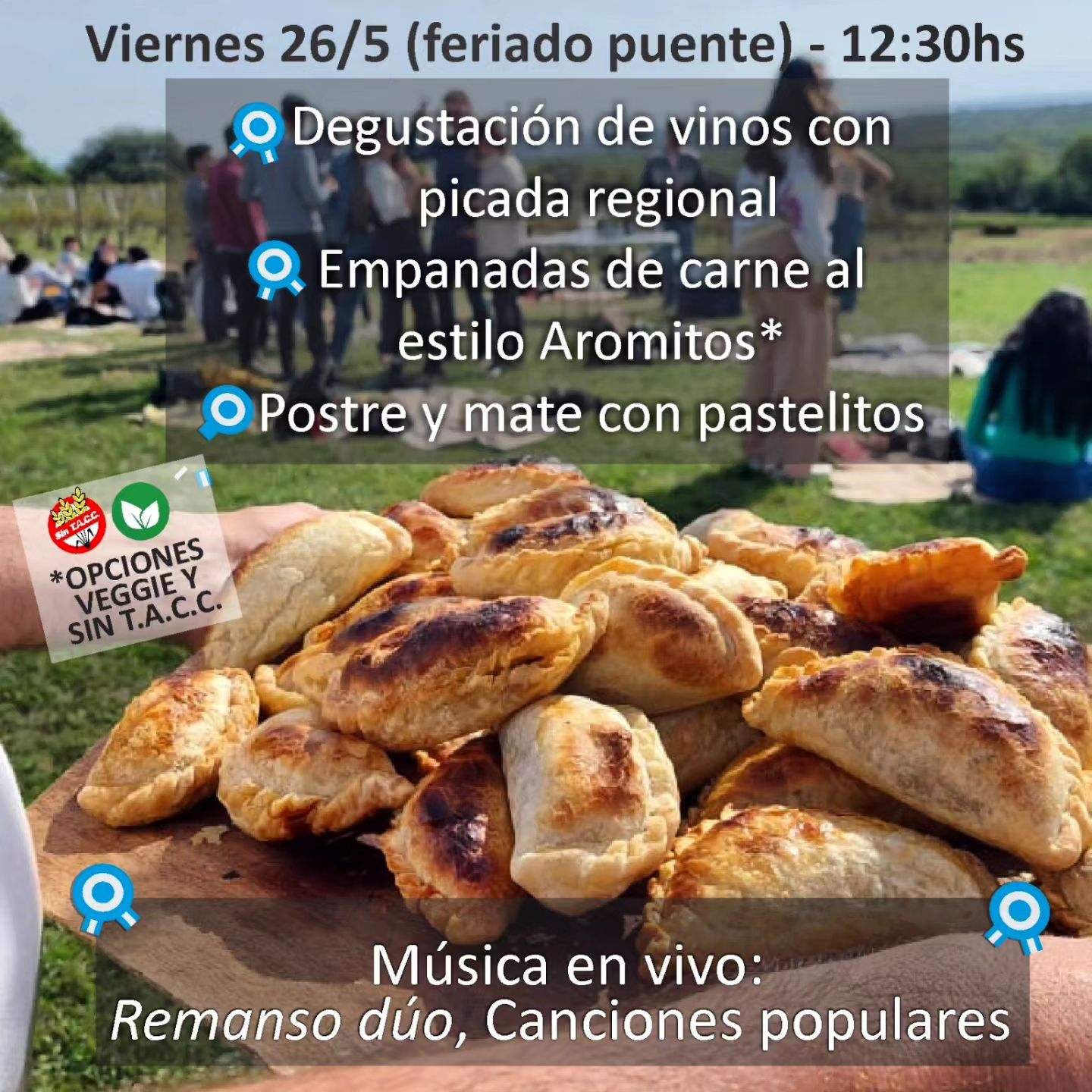 *Degustación de vinos, entrada de productos regionales, almuerzo de empanadas, postre de quesos y dulces regionales (opciones veggie y sin TACC).