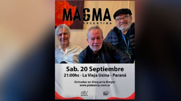 El emblemático grupo "Magma" dará un show en nuestra ciudad. El conjunto integrado por Alberto Felici, Alfredo Ibarrola y Pancho Torres ofrecerá un espectáculo con todos sus clásicos, en un recorrido por más de cinco décadas de trayectoria en la música popular. Fundado en 1974 en Paraná, es una de las agrupaciones más representativas del cancionero popular entrerriano. Con una impronta marcada por la raíz folclórica y la experimentación sonora, el grupo ha dejado una huella en la escena cultural del país, participando de festivales, encuentros y grabaciones junto a referentes de distintas generaciones.