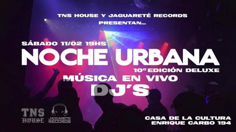 Jaguareté Records junto a TNS House presentan una vez más la tan esperada “NOCHE URBANA”, en su Décima y renovada edición de verano. Se presentarán Luuz-0 - Ash - Diogee - Auge - Ross - Teaeneka - Cup D Drug - Julián Villaraza - Actual - Perrito Jr - Anna Blou - Gonesty - Jay Scarred Dj - Negha y Tato-G - Big Nacho Dj - G-FONK y C.I.A.
