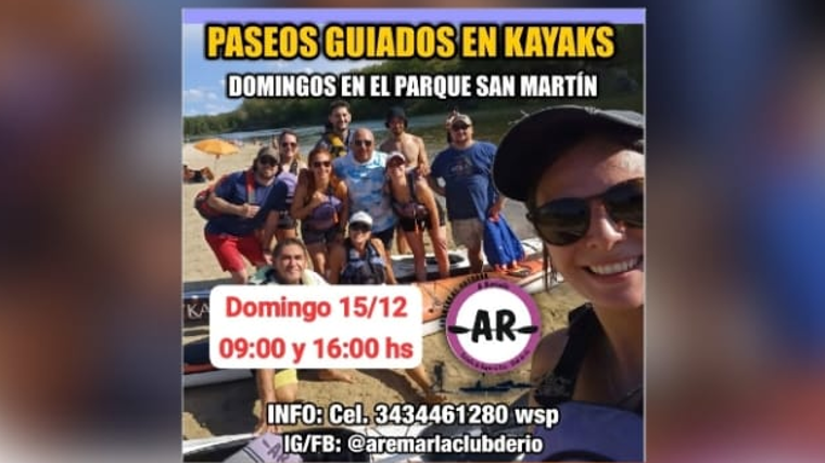 Se van a realizar paseos en kayaks y tablas de SUP. El punto de encuentro será el Parque General San Martin (Ruta Nac 12 a 25 kms de Paraná), Área Natural Protegida provincial para realizar una navegación por el arroyo Las Conchas con el objetivo de conocer bellísimos lugares, avistar aves y aprender un poco del área natural protegida.-