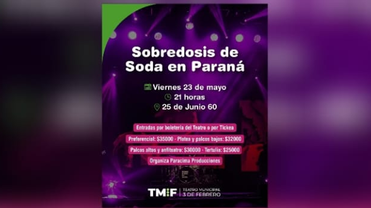 Entrada: Disponibles en boletería del teatro y vía https://tickea.com.ar/sobredosis-de-soda-en-parana/p/10081