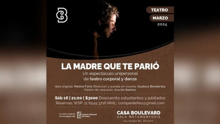 Se trata de un unipersonal de teatro corporal y danza. El mismo hace un recorrido por diversas maternidades y no maternidades. Hace preguntas acerca de frustraciones, sometimientos y elecciones sobre nuestros cuerpos y nuestras propias vidas, esforzando un intento por salir de lo aprehendido. En un cuerpo que se mueve en clave de danza y teatro, La madre que te parió escurre el agua viciada de pensamientos viejos y naturalizados contando cuatro historias que se enlazan a través de la misma pregunta: ¿Cuánto hay de elección en nuestras decisiones?