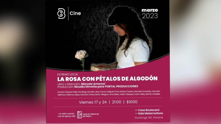 Se presentará "La rosa con petálos de algodón". Sinopsis: Gustavo Alsina es un joven escritor que llega a casa de sus tíos para inspirarse en una nueva novela. Allí conocerá a Marina, una paciente psiquiátrica veinte años mayor que él, escapada de la Clínica de Ruben Alsina, su tio.