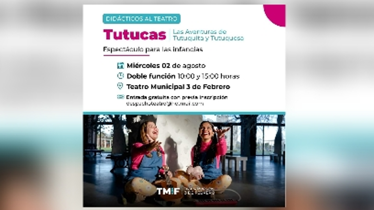 Continúa el ciclo Didácticos al Teatro con Tutucas “Las Aventuras de Tutuquita y Tutuquesa". El dúo musical presentara una obra para las infancias, en la cual la música, el juego y el movimiento se combinarán para brindar una experiencia participativa. A través de un baúl nos sumergiremos en la aventura del juego simbólico y la magia de la cotidianeidad.