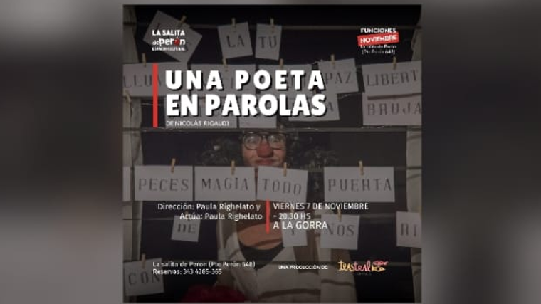 Una poeta en parolas espectáculo unipersonal protagonizado por Paula Righelato, en el que la payasa, queriendo decir poesía, se autocensura mientras se le revelan y rebelan las palabras. Con un títere centauro como partener, el texto - escrito por Nicolas Rigaudi - propone con humor una crítica inocente pero incisiva a los tiempos que corren.