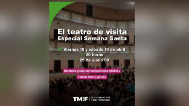 El Teatro Municipal "3 de Febrero" estará realizando Visitas Guiadas Especial Semana Santa. Se harán recorridos guiados con intervenciones artísticas. Los mismos se estarán realizando tanto este viernes 18 como el sábado 19 de abril.