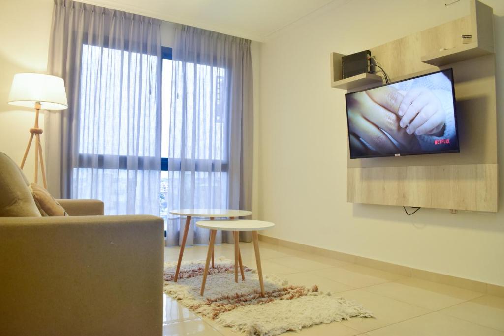 Baño, Cocina completa equipada: microondas, tostadora, pava eléctrica, platos, cubiertos, juegos de ollas, utensilios.Lavarropa, elementos de limpieza.Espacio de trabajo con wifi 300 megas. Televisión led en cuarto y living.Aire acondicionado frío/calor en cuarto y living. Juegos de sábanas y toallas